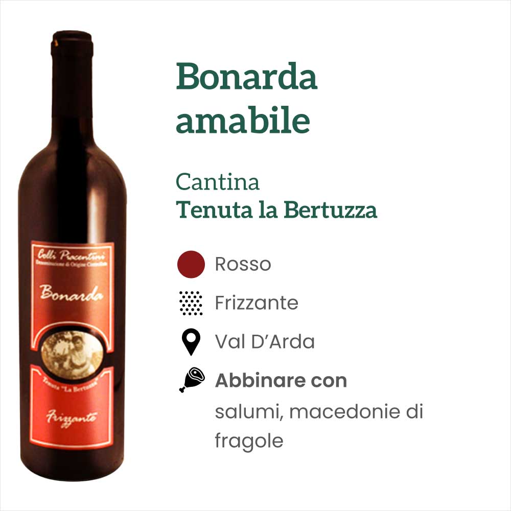 La gradazione alcolica leggera della Bonarda Amabile Frizzante della Tenuta la Bertuzza rende questo vino piacevole da bere anche da solo. Il meglio di sé lo offre però se abbinato a taglieri di salumi piacentini oppure a macedonie di frutta, meglio se di fragole per via del loro sapore zuccherino.