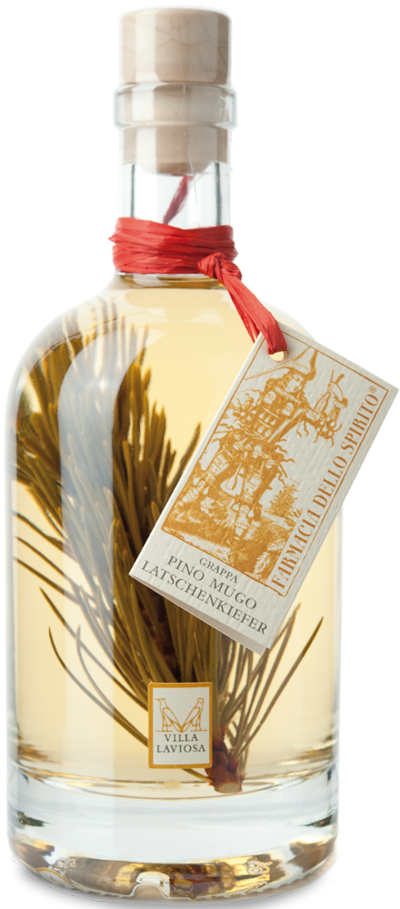 Il pino mugo (pinus mughus) cresce sulle montagne dolomitiche tra i 1200 e i 2700 metri altezza ed è utilizzato, per le sue proprietà balsamiche e digestive, nella preparazione di diversi prodotti tra cui creme, olii ed infusi. Le pigne e le gemme fresche del mugo, raccolte tra maggio e giugno, vengono subito lavorate per circa 45 giorni in grappa giovane di vinacce.
