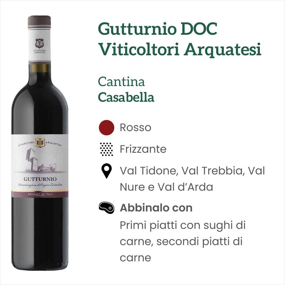 Il Gutturnio DOC frizzante di Cantine Casabella rientra nel marchio di produzione dei Viticoltori Arquatesi, il cui nome deriva da borgo piacentino di Castell’Arquato. Lo scopo della linea è quello di promuovere la viticoltura locale e la produzione dei vini piacentini.