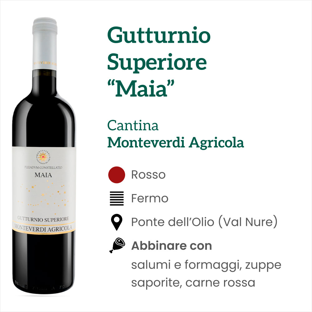 Il Gutturnio Superiore di Monteverdi Agricola “Maia” può essere abbinato a salumi piacentini e a formaggi, a condizione che questi ultimi presentino uno buona stagionatura. In alternativa si può optare per piatti caldi come minestre e zuppe saporite ma soprattutto carne rossa, con la quale il vino Gutturnio si accompagna sempre alla perfezione.
