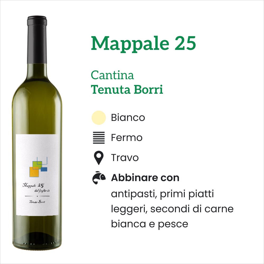 Il Sauvignon DOC “Mappale 25” della Tenuta Borri si presenta di color giallo paglierino con sfumature verdastre date dalle tecniche di fermentazione naturale utilizzate durante la produzione. ll profumo è invece aromatico, ma tuttavia delicato. Si possono percepire in maniera distinta i sentori di muschio selvatico e banana. Il sapore è armonico e fresco.