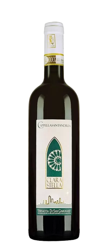 La Vernaccia di San Giminiano Clara Stella, ottenuto da uve raccolte a mano in piccole casse, vengono pressate intere, il mosto dopo una breve chiarifica a freddo, inizia la fermentazione a temperatura controllata in acciaio, con l’aggiunta del pied de cuve da fermentazione spontanea. Rimane in acciaio per 6 mesi sulle fecce fini per poi essere imbottigliato senza filtrazione. Successivamente si ha affinamento in bottiglia per circa due mesi.